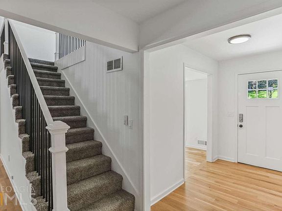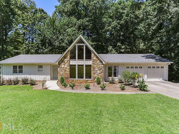 This magnificently renovated A-Frame Ranch is an East Cobb knockout with a traditional floorplan located in a desirable well-established Marietta subdivision and located in a nice little cul-de-sac lot for added privacy and tons of natural light throughout the home. Absolutely move-in ready, newer roof, fresh exterior, and interior paint, plus new garage doors. The craftsmanship is superior all around; you will instantly notice the beautiful 3.5-inch wide solid plank hardwood floor throughout the kitchen and main living area. Designer light fixtures and Minka Aire fans modernize the home. The great room kitchen combination is an entertainer's dream. The floor plan opens to a stunning A-frame family room with soaring 20 ft ceilings, massive windows with an abundance of natural light, and a gorgeous marble fireplace with a shiplap backdrop. Gather and relax in the great room adjacent to the designer chef's kitchen. This kitchen is decked with all the bells and whistles, an enormous quartz island, quartz countertops, stainless Whirlpool appliances, custom backsplash, soft close modern white cabinetry, and a huge built-in pantry around the corner from the refrigerator. Great flex space in a light-filled loft perfect for a home office or kid's space. Ample storage in the custom pantry, understairs storage, garage, and closets. Easily host large parties with a separate dining room and living room with floor-to-ceiling windows. Fall in love with the outdoors again; the spacious deck off the great room spans nearly the entire back of the home, well maintained and enormous. There are many possibilities, build a screened porch area large, flat-fenced backyard. The luxurious primary suite has double closets, new carpet, a designer bathroom renovation with dual vanity and quartz countertops, walk-in shower with a frameless glass door. The two secondary bedrooms are set up Jack-n-Jill style and share a renovated bathroom. Close to highly rated Pope High School and endless nearby shopping and restaurants round out the benefits. Make this your dream home.