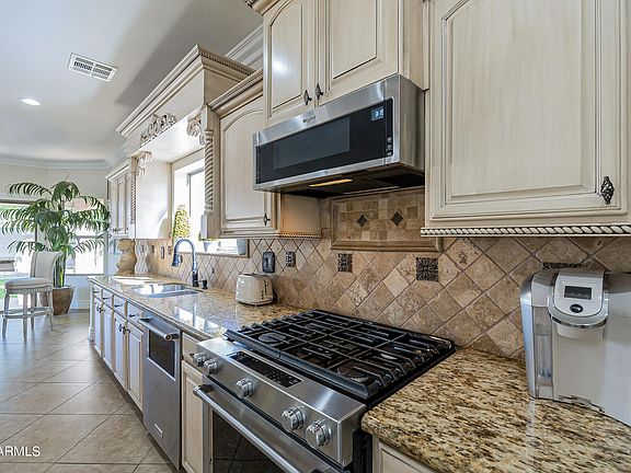 Situated at the end of an immaculately maintained cul-de-sac, with only one neighbor, this two-story home features full master suites on each floor. The second story also includes three additional bedrooms and a guest bathroom. The upstairs master includes a spacious closet, floating king-sized bed with LED trim lighting and integrated reading lights. The luxurious master ensuite includes dual standard and rain shower heads. The downstairs master suite doubles as an in-law suite or ''casita,'' with a floor-to-ceiling glass enclosed walk-in shower and floating cabinetry. Granite countertops lend the vast, open concept kitchen a distinctly sophisticated appeal, perched atop antiqued wooden cabinetry with a matching island and stone façade built-in kitchen table. The formal dining room includes three spherical wooden chandeliers adjoining the formal living room with ample space to accommodate even the most festive of occasions. Energy Star high-efficiency GE washer and dryer are included in a utility room with custom storage units.