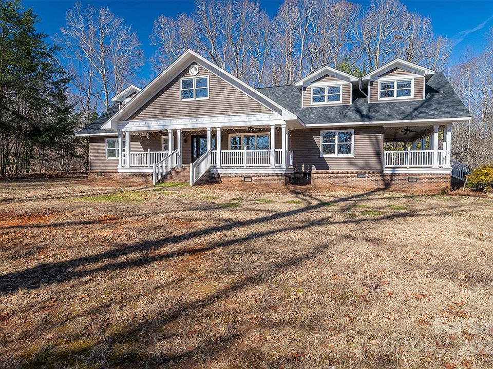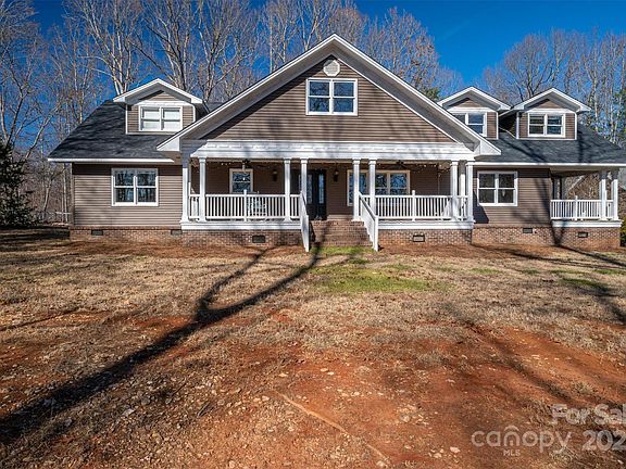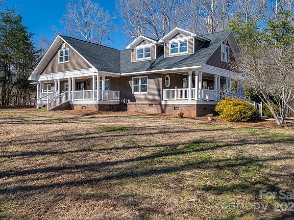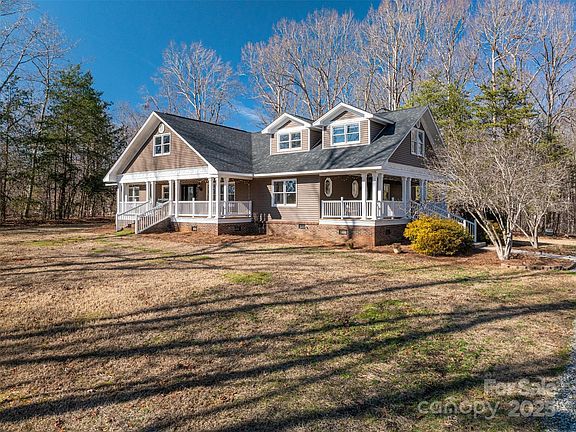 Sprawling private estate surrounded by woods sitting on 7 beautiful acres just outside of Charlotte! Must see! This charming Cape Cod home has TWO large & cozy wrap-around porches where you can enjoy your coffee in the morning, read, or simply sit and enjoy this beautiful wooded homesite and landscaping. Wide open floor plan with so many flex rooms! Three fireplaces! Gleaming hardwood floors. Gorgeous kitchen with custom cabinetry galore. Generous Primary Bedroom on the main level as well as a secondary bed/full bath. Upstairs has 3 more beds and lots of flex/rec space, craft rooms etc. Closets galore. Brand new 24x36 detached wired and insulated garage/shop to match the house. Stamped patio out back as well as fenced dog pen area. Secluded living, yet close to Crowders Mountain State Park & Daniel Stowe Botanical Garden. Charlotte Airport, 25 miles. Uptown, 30 miles.