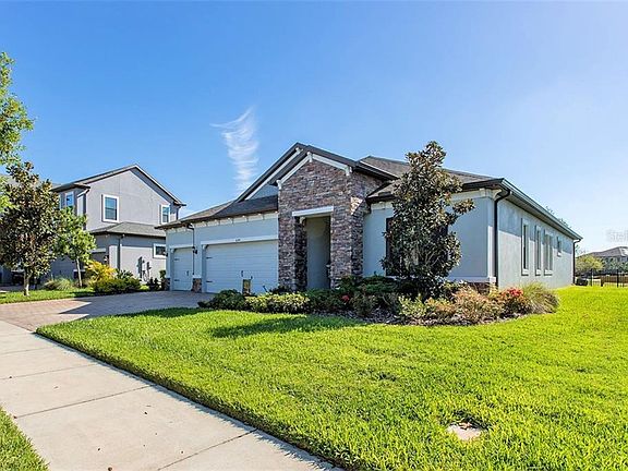 WELCOME HOME!! Rare ONE STORY, 4 bedrooms, 3 full baths with a 3 car garage just became available for you to make your new home! This stunning home sits on a breathtaking 65 conservation lot with a water view. This home has been meticulously cared for and shows like a model home. 80K in base upgrades when built, but the upgrades did not stop there!! Over 70K upgrades made in 2019 and 2020. The kitchen boasts designer 42 maple hazelnut cabinets with glaze and, 3 crown moldings, oversized center island, Cambia countertops, and newer (2019) top of the line Kitchen Aid appliances making this kitchen a chefs dream. The large walk-in pantry has custom shelving and drawers to make organization a dream. The kitchen is open to the breakfast area and family room. This open floor plan is perfectly designed for natural light, entertaining, and relaxing with family and friends. This 3-way split bedroom plan features a Master Suite with a tray ceiling, an en-suite with Cambria counters on the dual vanities, a soaking tub, a walk-in shower and a walk-in closet with custom system that will make your friends and family jealous. The second bedroom is ideal for a long-term guest as it has its own bathroom with a pleasing walk-in shower and walk-in closet. The additional 2 bedrooms share a full bath that is situated between. The office, located at the entry has French doors for both function and beauty. The formal dining is easily accessible for those perfect formal dinners on special occasions and holidays. There is upgraded/luxury carpet in the bedrooms and amazing upgraded wood tile throughout the remainder of the house. A triple set of Sliders leads to the newer (2019) large, screened lanai with travertine pavers, a luxurious Hot Spring Spa, and a tranquil view of woods and water, and the luscious landscaping and flower. This landscaping extends to the front of the house with great curb appeals that is accented by the decorative glass front door and beautiful stones and hardi accents. This incredible house has so many upgrades and finishes, it must be seen to appreciate the beauty. All this in the Award winning Starkey Ranch, Top Selling Community in Tampa Bay, offers K-8 Schools opening Summer 2021, Library + Theater, 2 community pools, 3 playgrounds, 3 dog parks, 20 mile trails, garden, kayaks on Cunningham, ongoing events and so much more. Schedule your showing today!
