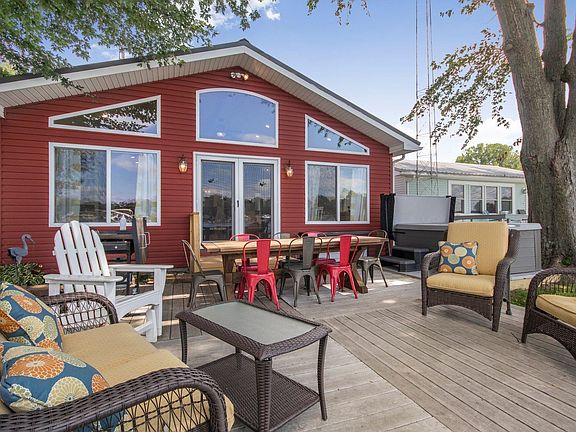 Live your Lake Life! You will love this stunning home on the beautiful and peaceful Nyona Lake. A huge wall of windows gives you an expansive view of the lake, your brand new dock, composite deck, new hot tub, gravel firepit area right on the shoreline, Blackstone grill, and porch swing. This home is being offered with furniture and all appliances included, so it is ready for you to move right in! Totally turnkey- Live an amazing indoor/outdoor lifestyle with the spaces blending seamlessly here. Inside you'll find 2 bedrooms, an additional bonus room that currently has bunk beds, lots of closet space, and then the huge 26'x 26' great room with pool table, open concept kitchen with stainless steel appliances, fireplace, large dining room table, and plenty of seating. In back, there's an attached 2-car carport with attached heated workshop, storage shed, and lots of attic storage. Across Lakeshore Drive is an additional gravel lot for extra parking. Immediate possession means you can enjoy that lake life still this season!