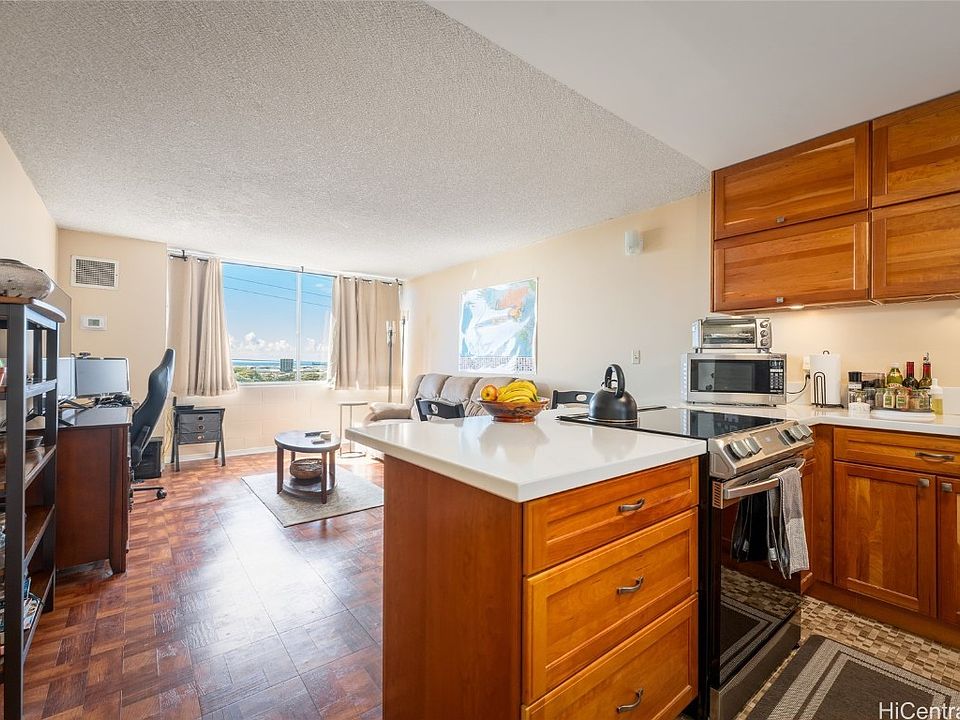 Rarely available, highly sought after Harbour Ridge is the one you've been searching for. Ocean and coastline views coupled with the convenience of being located near Honolulu International Airport, Pearl Harbor, golf courses, shopping centers and much, much more. This centrally located Salt Lake condominium is nestled in a cozy cul-de-sac and is a secured building with a swimming pool, hot tub and guest parking. Renovations in 2019 include new kitchen cabinets & countertops as well as bathroom improvements: new vanity, shower/tub enclosure, faucets and fixtures. New range was purchased in October of 2023. The Central AC system was overhauled in 2021/22 with new digital thermostat, new motor, new coils and improved with mold-resistant insulation. This desirable unit is closer to the elevator than most units for a comfortable walk to and from your home and the covered parking is a great benefit as well. The reasonable maintenance fees include: Electricity, Central A/C, (hot) water, sewer, basic cable TV and internet services.