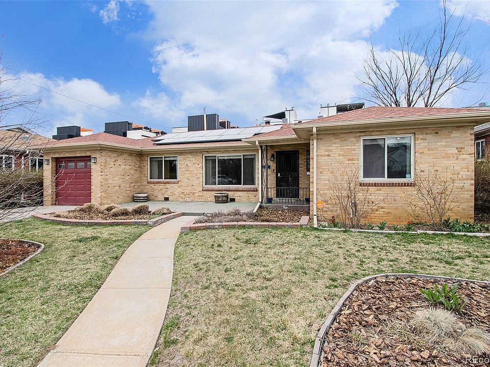 This is the one you've been waiting for! This renovated Skyland ranch offers an open floor plan, three large bedrooms on one floor, yet the primary suite is off on its own wing and features a custom-stained concrete floor, attached bath and walk in closet. You'll also appreciate the laundry room with storage which is conveniently located between the Primary Suite and the kitchen. Love to entertain? Wait until you start cooking in this updated kitchen, complete with 5 burner gas stove, side by side refrigerator, quartz counters and open to the dining area. Create that cozy vibe in the living room with a fully functional wood burning fireplace, or, take your friends out to the newly constructed 3 season Pergola, right off the living room, complete with an installed electric heater, ceiling fan, electric privacy panel and electronic roof to keep you dry in the rain or allow you to see the stars on a clear night. Raised garden beds are off to one side of the ample backyard, along with your rainwater barrel, leaving plenty of room to throw a ball for the dog or kids, and still utilize the side yard for great storage. Had enough of Xcel and trying to figure out when you can cook and do your laundry? You'll love the active solar ($14,250 left in the lease to own-what a deal!) and the newly installed energy efficient Goodman HVAC (2020). Need storage? The garage includes a Fast Tracks Organization, the second bedroom has Elfa Storage installed in the walk-in closet and you will find additional storage in the laundry room. Close proximity to City Park, the Denver Zoo, Museum of Science and Nature, RiNo and just up the road from Colorado and 9th. Denver living doesn't get much better than Skyland. You'll love everything about this well cared for home, including the peace of mind that comes from the fully owned security system with Smartlock and video doorbell. You're going to want to call this one your new home. Photos coming Friday. Showings start Friday.