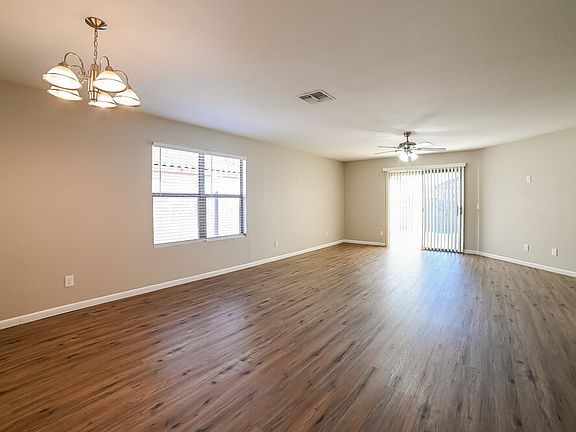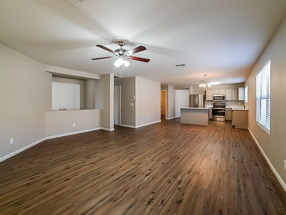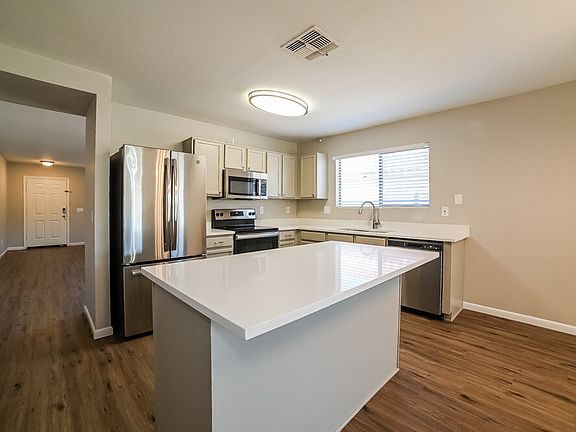 This Phoenix, AZ rental home boasts a number of excellent features and amenities in addition to its four-bedroom and two-bathroom layout. With an attached garage, a big enclosed yard, and a laundry room, this pet-friendly home has everything you need. The modern vinyl plank flooring in the living room looks great with the neutral-colored walls, and you'll love how this space flows right into the kitchen thanks to the open layout. Long white quartz countertops and a center island offer abundant meal prep space, and there's plenty of storage space in the pantry and the all-white cabinets. The main bedroom suite is at the rear of the home and comes with a good-sized walk-in closet and an en suite bathroom. Don't wait to schedule a private tour!