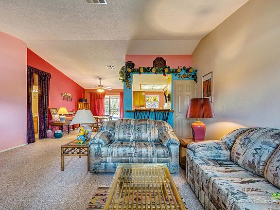 Centrally located impeccably maintained three-bedroom two-bath energy efficient home with solar heated pool system in its own desert sanctuary. Spacious design shaped Pool and Spa surrounded by lush mature landscaping, and water efficient planters both in front and rear yards. Alumawood patio covering, and custom brick patio, and pool deck. Well balanced front yard with desert pine and palm trees. Open floor plan and spacious bedrooms make for a perfect starter home, or for a less to maintain, and more to enjoy lifestyle.