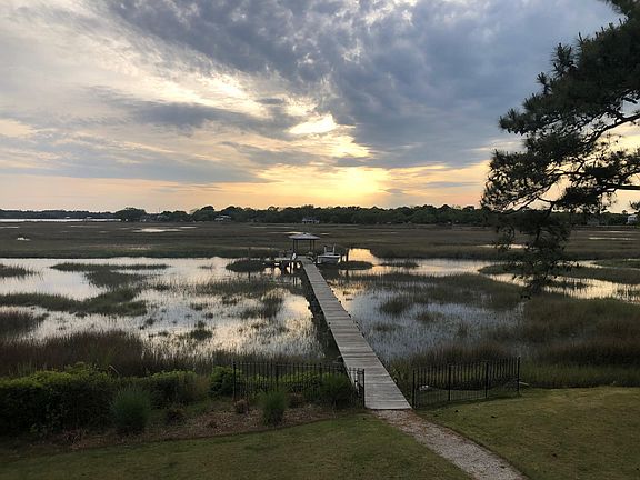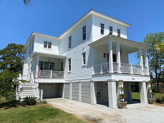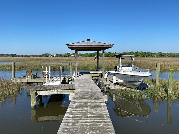 This stunning Lowcountry residential masterpiece and 2016 Prism Award Winner (Crosby Creations Drafting & Design) capture's the essence of relaxed elegance. The airy, light-filled interior and expansive views of the marsh and Intercoastal waterway beyond, this home melds classic southern and island architecture. This property is nearly a half-acre, with a 165' dock that leads to a covered pier head and drive-on boat launch. Created with an indoor-outdoor lifestyle in mind, there are oversized Anderson custom windows and eight foot double doors that lead onto expansive decks - great for watching sunsets. With this elevated floorplan, the first floor consists of 10' ceilings in the Living Room/Kitchen/Dining area combined and offers a separate private Guest Room and Bath. Space is delineate by an 8'x4' Kitchen island with Carrara Marble countertops and burnished gold pendant lights overhead. A hand hewn mantle over the (gas) fireplace, built of white brick and shiplap offers a beautiful vignette against the Caribbean Pine floor that are used throughout the home. Cable wire railing on the staircase is perfectly in keeping with the home's coastal feel, and leads upstairs to two secondary Bedrooms that share a Jack and Jill Bath. To the back of the second floor, the expansive Master Bedroom (10' ceilings) is simply a sight to behold. The Master Bath includes a freestanding tub, and walk-in glass shower with Carrara Marble Herringbone Floor Tile and Subway Tile walls. The 1,300sqft two-car Garage space on the ground floor provides lots of space for storage, a workshop, and simply a place of quiet repose. There is an elevator shaft in place, should the new owner wish to install an elevator. The backyard is truly it's own private enclave, and is surrounded by beautiful plantings including Grapefruit and Meyer Lemon trees; this space includes a hot tub, fire pit, Adirondack chairs, and oversized custom-built planters set on a pea-gravel surface.