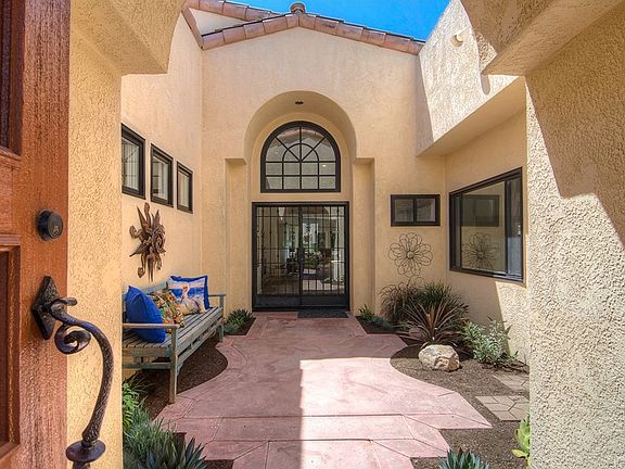 Rare single level 4 bedroom home in the exquisite community of Marbella Estates. This home has been updated beyond belief! Upon entry thru the glass double Iron doors you will find new rich hardwood floors, fresh new interior paint and a wonderful open floor plan. The spacious open kitchen has been updated with all new cabinetry, new sub zero refrigerator, large center island complete with wine fridge and gorgeous new counter tops. Soaring ceilings thru out the home make every room light and bright. French doors off the dining room lead to the private lush patio area. Double door entry to the master suite with his and her walk in closets, fireplace and french doors to a private master patio. A resort like master bath with soaking tub and walk in shower complete with a towel changing area. Dual sink vanity with granite counters and so much more. Spacious secondary bedrooms complete with new carpet and paint. One secondary bedroom offers a private bathroom and sliding door to the patio. The 4th bedroom is located in the private casita complete with t.v and private bath and closet. The casita is great for your extended family or older child or even a home office. This home has a spacious driveway with attached 2 car garage and also offers a golf cart garage. The garage has plenty of storage and provides a small workshop area perfect for your weekend projects. This home really is a breath of fresh air and offers everything one could desire!