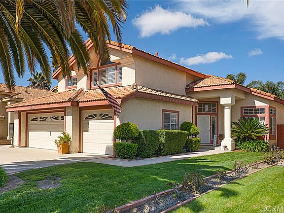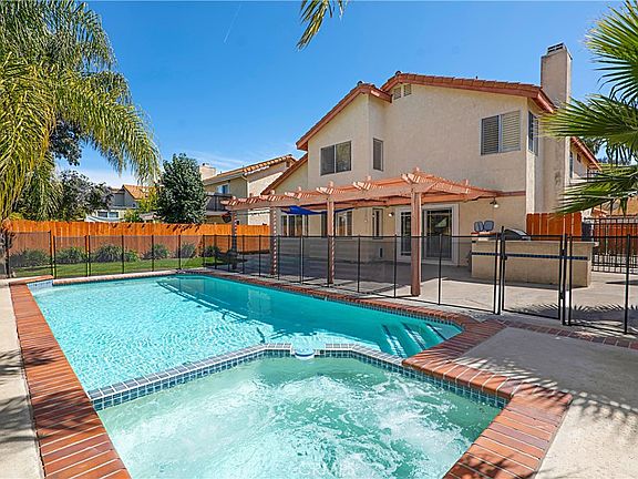 Get ready to splash into summer in this entertainer’s sparkling pool home! Move-in ready 5 Bedroom 3 Bath home complete with boat, trailer or potential RV parking and solar! Located in a desirable established neighborhood with Low taxes and No HOA! The tiled entry welcomes you with vaulted ceilings, natural lighting, neutral paint and skylights. The floorplan flows to the spacious living room and dining room area with plantation shutters and warm laminate flooring. The chef’s kitchen features granite counters, double stainless-steel oven and a gas cooktop. Open breakfast bar seating and the inviting dining nook is perfect for gatherings! The kitchen is adjacent to the family room with a custom stacked stone fireplace and the sliding door opens to your covered patio and backyard. There is downstairs main level bedroom for an office, guests or in-laws with its own entry to the hall bath. The stairs and upper level hallway and primary bath have been updated with luxury vinyl plank. Enter through the double doors into the primary suite with a retreat that boasts a spa-like remodeled primary bath! Complete with a freestanding soaking tub, dual raised basin sinks, quartz counter, a separate frameless tiled glass shower and oversized walk-in closet! There are 3 additional bedrooms upstairs and the largest could also be a craft room, game room or as an additional office space. This home is beautifully landscaped front and back with hedges, roses and tropical palm trees! Enjoy hosting fabulous pool parties, unwinding in the spa, grilling on the built-in BBQ island, playing games or outdoor movie nights on the grassy area in your backyard oasis! Additional features include a three-car garage, pull-down attic storage, water softener, and energy savings with the Sun Power Solar lease. Conveniently located to freeway access, shopping, Temecula schools, parks, Promenade Mall, restaurants and within close proximity to Temecula wineries! This home offers the perfect blend of comfort, style, and convenience. Please check out the virtual tour!