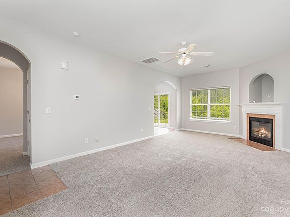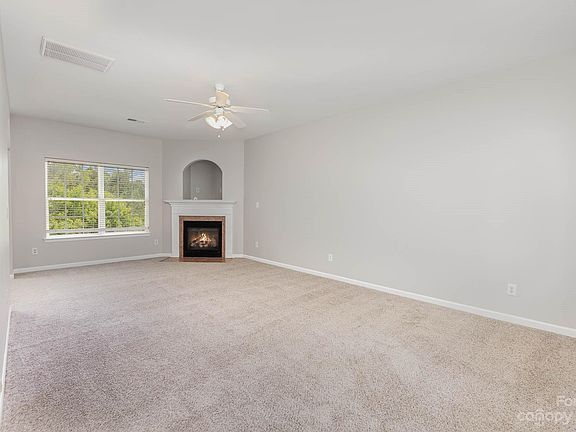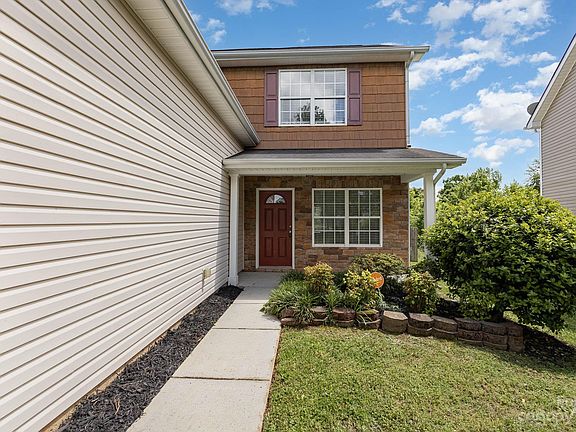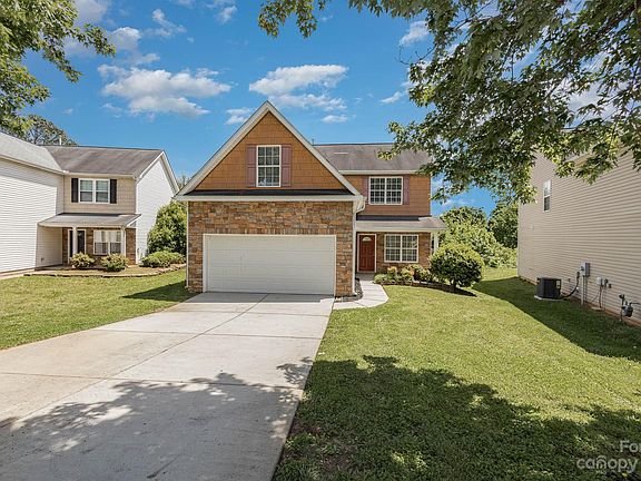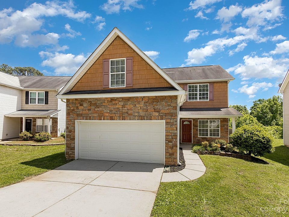 This cedar and stone 3-bedroom beauty is located in the popular community of River Walk. The home is situated near the back of the neighborhood with a nice view and wooded area off the backyard. The open kitchen features ceramic tile flooring, granite counters, and black appliances. The adjacent family room features a gas fireplace and lovely archways that add a ton of charm. All bedrooms are upstairs, and the primary suite has a separate tub and shower ensuite. You'll find great natural light in this home that is clean, fresh, and move-in ready! Fantastically situated near Concord Mills plus other great shopping and restaurants this location has a lot to offer!