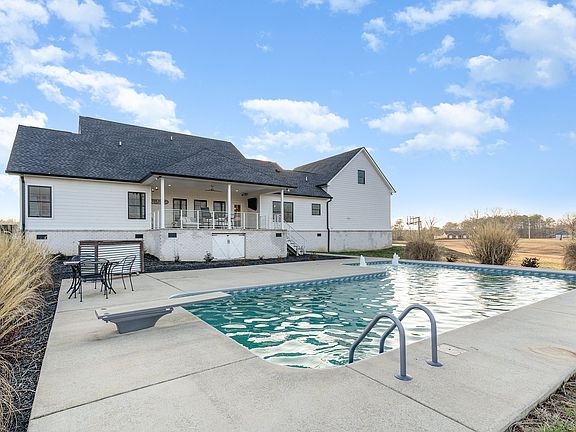 Just in time for summer! Three-year-old modern farmhouse nestled on 5+ picturesque acres in charming Centerville. A covered rocking chair porch spans the home, offering relaxation and serenity. Inside, modern comfort blends with farmhouse charm while an open floor plan allows for effortless flow between the kitchen, dining area, and living space. A kitchen island with seating, storage, sink and dishwasher, ensures you never miss a thing, while the white brick fireplace adds a touch of elegance. Three of the five spacious bedrooms are located on the main floor. Upstairs you'll also find a versatile bonus space with endless possibilities - think home office, fitness studio, playroom, or another creative space tailored to your needs. The backyard oasis includes an inground pool and covered porch with breathtaking views of the expansive 5-acre property ideal for relaxing or outdoor entertaining. The 2-car garage provides ample space for your vehicles and storage needs.