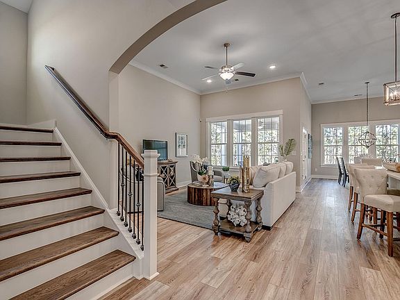 This beautiful Craftsman style Fullerton is located on a water view homesite. The great room includes a fireplace and ceiling fan and is open to the large kitchen. The kitchen is complete with gourmet appliances, upgraded cabinet construction with soft close, & waste basket cab, brushed nickel hardware, under cabinet lighting, single bowl sink, granite counter tops, backsplash tile and pantry. The dining area is ample and open to the kitchen and great room on the rear of the home. Directly off the kitchen is the laundry room with upper and lower cabinets. The primary suite includes a tray ceiling, five foot tiled shower with glass enclosure, double bowl vanity with drawer stack, expansive framed mirrors, enclosed water closet and generous walk-in closet. The downstairs guest room has direct access into the the second bath and the bath is also accessible for guests. Take the hardwood stairs to the second floor to find the 3rd bedroom and full bath with plenty of closet space and an easy accessible attic storage area. Other features of this home include coat closet, linen closets, tankless hot water heater, luxury vinyl plank flooring, large craftsman style base boards, covered rear porch, grilling pad with gas line, irrigation and fully sodded yard. Photo is for representation only not actual home.