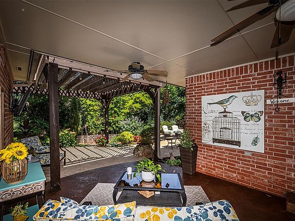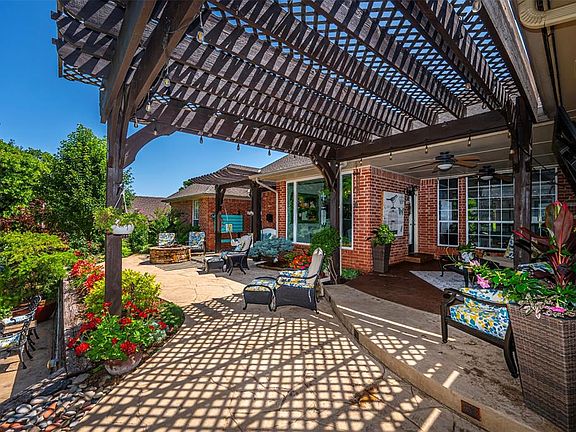 Welcome home to your own piece of paradise in East Edmond! A wonderful place to entertain your family and friends or simply to relax after a long day! Enjoy your outdoor kitchen, outdoor tv that works and stays, 2 pergolas, one with a huge swing that stays, stamped concrete patio, fire pit, and pond with two waterfalls, all surrounded by lush landscaping and trees! The home backs to a wooded area giving you lots of privacy. The pond has a stone path around it, and the trickle from the waterfalls is so soothing. A raised vegetable garden on the side of the house has an automatic drip irrigation system from a rain barrel collection. There is an automatic mosquito mister in the backyard that operates in the warmer months. Located minutes from I-35, shopping, restaurants, and a highly rated school district. This lovely 4 bedroom, 3 bath home has been kept meticulously. You will find wood flooring, plantation shutters, stacked crown moulding, ceiling fans, a gas log fireplace, and lots of storage throughout. This home has a formal dining room as well as a breakfast area in the kitchen. Cozy family room, and nice sized study. The kitchen was remodeled in 2021 with new appliances and quartz countertops. The primary bath was remodeled in 2017. New AC in 2022 and hot water tank in 2020. In 2020, the large west facing window in the 2nd dining was replaced and has a discreet screen that lowers electronically to reduce glare in the afternoon. Storm shelter in the garage. The third car garage was enclosed and is climate controlled. It has walls of cabinets on both sides with a countertop work surface, perfect for the hobbyist, tools, and holiday decorations. Sprinkler system. Security system. A small playground is within walking distance. There is a larger park on the other side of the neighborhood, and a community pool. This one will not last long.