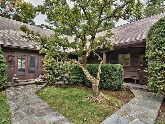This gorgeous historic stone home is situated on 1.3 acres on Skytop Lake. Upon entering this nearly 6,000 square foot home through the inviting courtyard into the grand living room, one can't help but be captivated by the stunning lake views. The home is set mainly on one floor and features a large open family room with stone fireplace, mid-century kitchen with butler's pantry, sunny dining room and breakfast nook, all with gorgeous natural light. Each of the main rooms has spectacular lake views. The house has 6 very spacious bedrooms and 5.5 baths. The western exposure allows for dramatic sunset views of Skytop Mountain and Skytop Lodge from the flagstone patio, screened porch and dock. Skytop Resort offers world class amenities only 2 hours from NYC and Philadelphia.