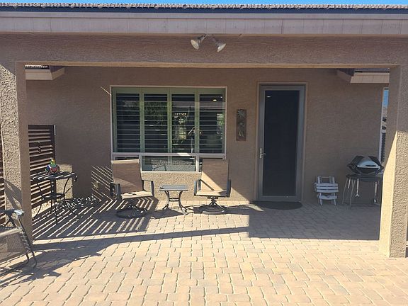 Beautifully furnished winter rental available in Sunland Springs Village! This home features elegant shutters throughout and a modern kitchen with granite countertops and stainless steel appliances. The primary bathroom boasts a walk-in shower, marble countertops, and dual sinks, while the primary bedroom includes a spacious walk-in closet with built-in shelving. The garage is well-equipped with a washer, dryer, and a utility sink set in a cabinet. The backyard is ideal for entertaining, offering an inviting space to gather around the fire pit and enjoy socializing. A sliding wood barn door separates the second bedroom and bathroom, adding a touch of charm. Additional amenities include a water softener and central vacuum system. Don't miss out on this incredible rental! Rental time frame Dec-April