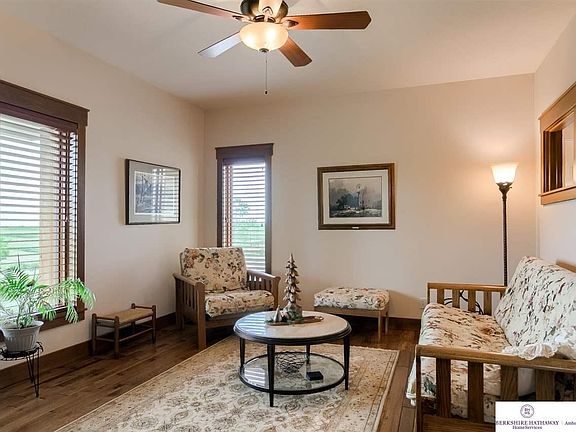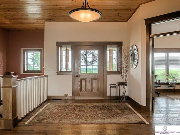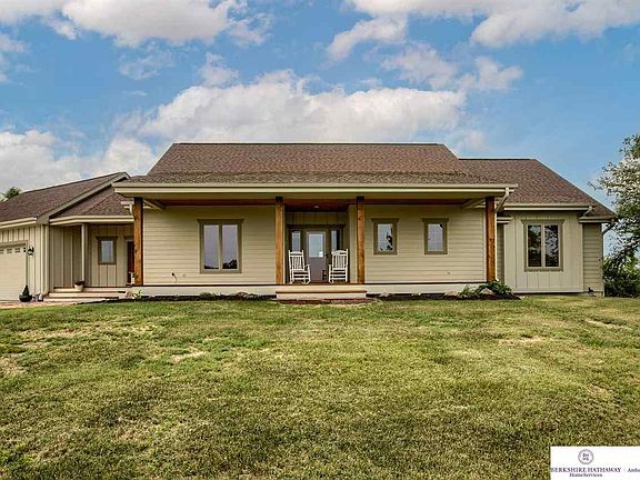 Stunning Custom Ranch built by Pohlad Custom Homes. Sits on 15 private acres overlooking scenic rolling hills & a gorgeous 40x36 ft rustic style barn by Sandcreek Post & Beam. Main floor has distressed hickory floors w/ ceramic tile mudroom, bath & laundry. Hunter Douglas blinds throughout. Spacious kitchen w/ abundant cabinets & walk-in pantry. Large primary bdrm w/ his & her walk-in closets, dual vanities & beautiful cast iron claw foot tub. Great room w/ floor to ceiling stone gas fireplace open to kitchen & dining area. Access to outside deck & screened porch from either side of dining area. Tongue & groove ceilings adorn the 30ft front porch, mud room, screened in porch as well as the large entry. LL has ceramic floors w/ 2 bedrooms & full bath. Large family room & multi-purpose room w/ exterior doors. Large workshop w/ double doors to the exterior & storage room w/ extensive shelving. Geothermal heating & AC. All flooring zoned radiant heat. Only 45 mins to W Omaha & Lincoln.