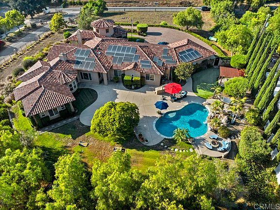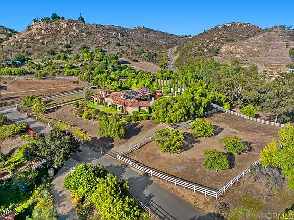Stunning, turnkey, 4,658 Sq Ft. single story PANORAMIC VIEW + ride in-ride out horse property on 2.44 usable acres in Bonsall. 4 large bedrooms PLUS an office. New complete HVAC system, new Sub-Zero, new Bosch dishwasher, travertine flooring and backsplashes, granite countertops, stainless appliances including a Thermador double oven and a Butlers Pantry with a wine/drink refrigerator. Thermador professional range with pot filler, spacious breakfast area, high ceilings throughout and a a 64 panel PAID solar system! The primary suite has a retreat area, amazing views, high end finishes, spacious custom closet and separate walk in shower and soaking tub. Gorgeous custom designed pool with flagstone coping and plenty of entertaining areas. Private view lot that is fully fenced and gated with wrought iron and equestrian fencing and cross fenced areas. Wide, secondary access gate on property. RV Parking space easily accessible. Four horse stalls with turnouts and two wash racks. Approx. 3/4 acre arena. Bonsall school district.