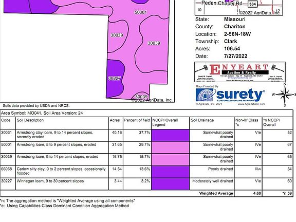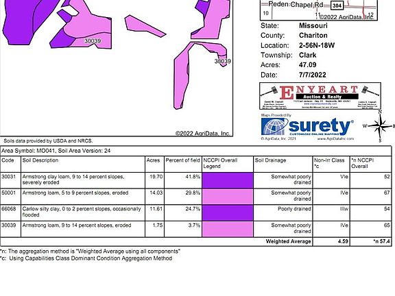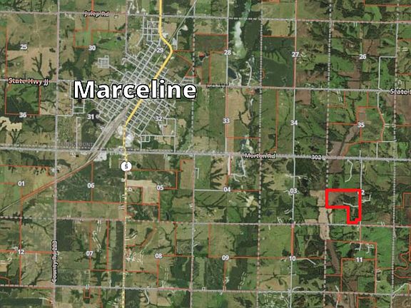 ONLINE ONLY AUCTION - Price Shown is Starting Bid and Not a Listing Price! 105 Acres m/l (30499 Peden Chapel Rd, Marceline) - Approximately 47 acres tillable, with the balance in heavily wooded draws. The cropland areas are gently rolling throughout the East 2/3's of the property and contains a high producing creek bottom along the West side. This property is an ideal wildlife habitat, with ample food and water sources, as well as abundant hardwood trees throughout. Numerous vantage points allow for unlimited options for tower stands. Entry points from the South and East sides also allow for ease of access for multiple hunters. It also features a 1,644 sf home with a 30'x30' detached garage situated along Peden Chapel Rd. The home has 2 Bed, 2.5 Bath, as well as two living rooms, a utility/laundry room, and kitchen/dining area. This home has great potential for a primary residence or hunting cabin, with plenty of storage for UTVs, boats, tools, you name it! Don't miss out on an incredible property located near Marceline on a low traffic road.