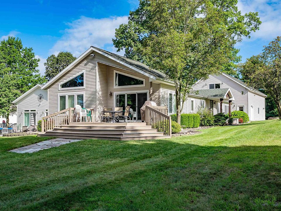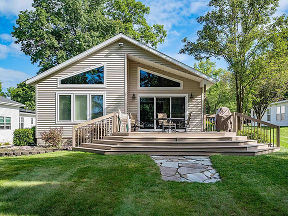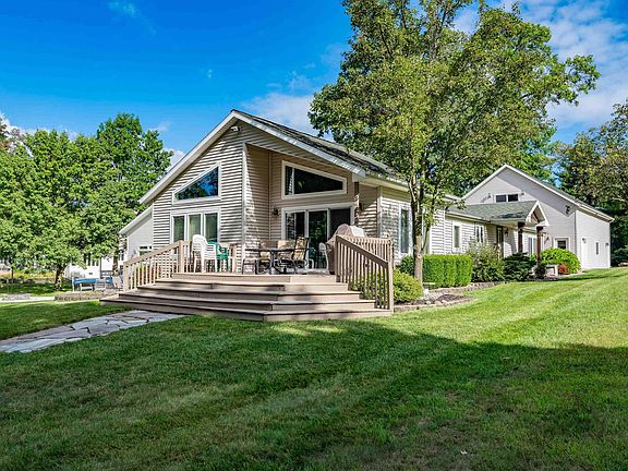 This stunning lakefront retreat is lakeside living at its finest with this beautiful 3-bedroom, two full bath home situated right on a ski lake. Enjoy endless outdoor fun and relaxation with a large platform dock and a spacious deck—perfect for soaking up the sun and taking in breathtaking water views. Inside, the home features a bright and open great room that flows seamlessly into a gorgeous, large kitchen complete with an island bar and plenty of seating for family and guests. Ideal for entertaining or casual meals, the kitchen is truly the heart of the home. The property also boasts a huge oversized, 30'x40' detached garage with a bonus unfinished room above, perfect for a workshop, studio, or extra storage space. This lakefront property offers flat land and plenty of parking. Whether you’re skiing, boating, or simply unwinding by the water, this lakefront gem offers the perfect blend of comfort, functionality, and scenic beauty.