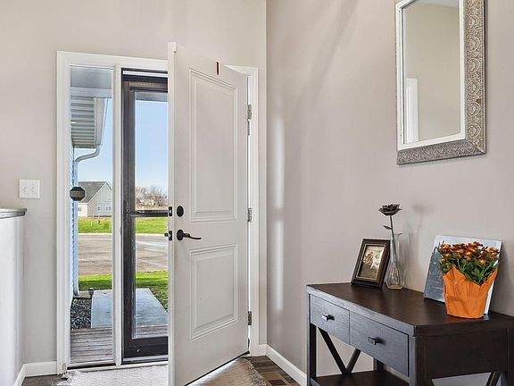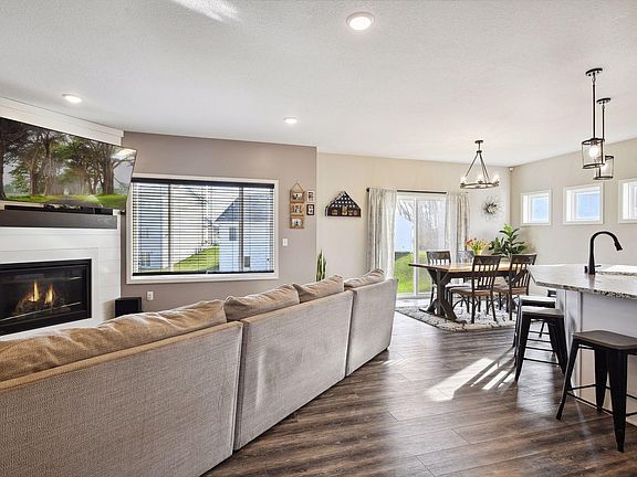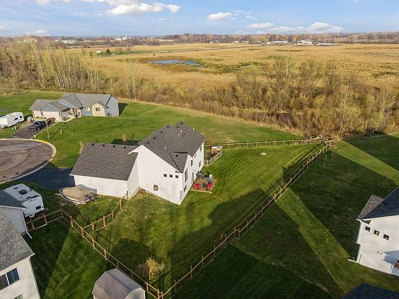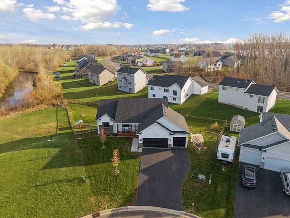 Welcome to this 2020 modern farmhouse rambler located in the Windgate at Carrigan Lake neighborhood. Perfectly situated on a .3 acre lot, fully fenced and located on a quiet cul du sac. Upon entering the home you have a spacious, cedar front porch. All living facilities on the main level include a spacious kitchen with white shaker cabinets, a large angular island, SS frigidaire appliances, granite counters and a spacious pantry. The kitchen and informal dining room lead into the open living space with a gas, shiplap fireplace and an abundance of natural light. All three bedrooms are conveniently located on the main level with a full bath. The primary bedroom features vaulted ceilings, a walk in closet and en-suite 3/4 bath. Main floor laundry hosts an LG washer and dryer with wi-fi. Enjoy a "shop" in your garage with the third stall being extra long. Conveniently located near multiple parks, Carrigan Lake, shopping and restaurants. Just 35 miles west of the Twin Cities.