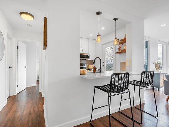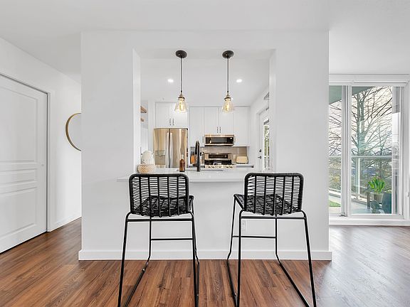 Welcome to The Boardwalk. Completely renovated in 2019 this modern 2 bed/2 bath TOP floor & corner suite offers the ultimate privacy, surrounded by greenery, w/ no neighbours above & only 1 shared wall. The interior boasts a bright & spacious floor plan w/ vinyl plank flooring throughout. The kitchen has been opened up, featuring a counter bar, stainless steel appliances & quartz countertops. Floor-to-ceiling windows flood the living space with natural light, opening onto a large deck w/stunning views of the trees & river. The spacious primary bedroom offers his & hers closets, a spa-like ensuite w/heated floors & a soaker tub. 1 parking & 1 storage. Amenities include gym, guest suite & workshop. Amazing River District location just steps to trails, parks, shopping, restaurants & transit. Open House Sat April 13, 11:30AM - 1:30PM.