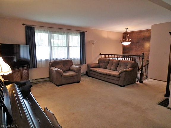 Wooded back drop in a desirable neighborhood. 4 bedroom home with 3 bathrooms, beautiful view from 2 tier deck, 2 car garage, large addition was added on for larger Master bedroom, wall closets and door leading to the top tier deck, spacious bathroom with walk in shower. Finished basement! Utilities in high usage months, gas, electric, sewer-$509. Natural gas, electric baseboard was original heating system. Central Air.