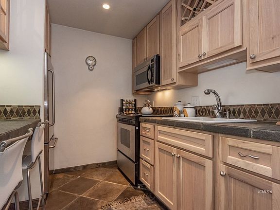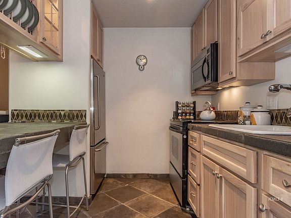 This perfect studio is nearly a total remodel including: all new kitchen cabinets, some with lit interiors and windowed doors. Beautiful slate counters w/diamond shaped design back splash. All stainless appliances including refrigerator, oven, range and microwave. Matching chairs create dining for 4 at the new slate counter between kitchen and living area. Fabulous queen size Murphy bed folds up during the day to create more space. The two Pottery Barn twin sleeper sofas open up into beds in the evening and double as over sized chairs by day. Bathroom is completely redone: jacuzzi tub with chromatherapy lighting and shower,. Can be set to one color or will go through multiple colors for relaxing effect. New cabinets and sink and fixtures. Flooring is diagonally placed slate throughout. Sliding windows opening to upgraded Trex deck have pleated window shades that can raise from bottom or lower from top to ensure privacy. The very low HOA makes this treasure of a condo a perfect buy. If woodstove needs to be changed, that will be buyer responsibility. To be sold mostly furnished. If square footage is important to buyer, buyer shall determine.