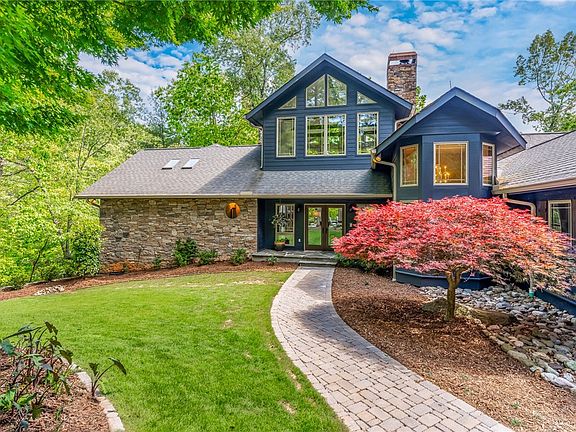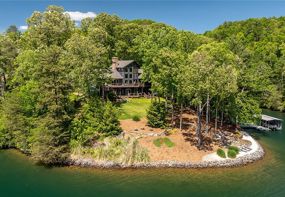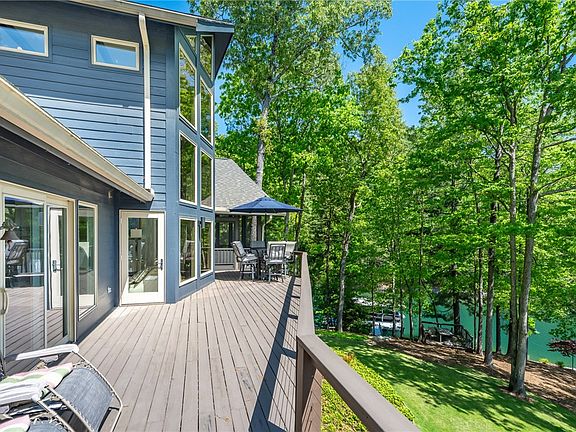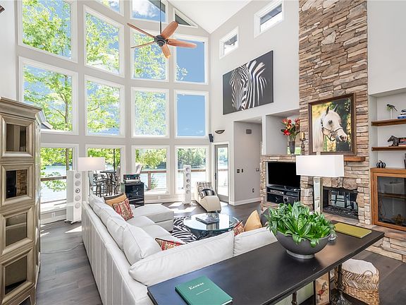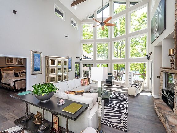 With a touch of mountain modern architecture, including a 30’ tall interior wall of windows, this custom-built Vineyards residence is unmatched for quality of location, waterfront, build quality and pricing. 1.35 acres of point privacy with over 600’ or waterfront and lake views from all principal rooms. Updated main level including floors, granite kitchen counters, paint and new appliances. Meticulously maintained interior and exterior condition, including recent roof replacement, exterior paint, new screen porch, exterior decking, and Water Furnace. A gentle slope through mature, beautifully maintained landscaping leads to the quiet and protected cove location, with deep, clear, emerald green water and all customary dock conveniences. The point property, situated at the end of a quiet cul-de-sac, provides long lake, 180 degree views. With the primary bedroom main floor, and two large, walk-in closets, access across the open floor plan through the great room with double sided gas fireplace, into the dining and kitchen area, is seamless. The lower level boasts three additional bedrooms (two en-suite), and a generously sized recreation room that leads to an outdoor patio. A lake storage room, home to the new, geo-thermal Water Furnace, has ample room for dock toy storage and an exterior door with convenient access to the dock location. A two car garage rounds out this exceptional lake from property offering. See Supplements for plat, property disclosure, and accompanying paperwork.