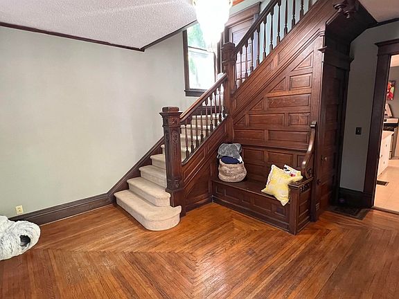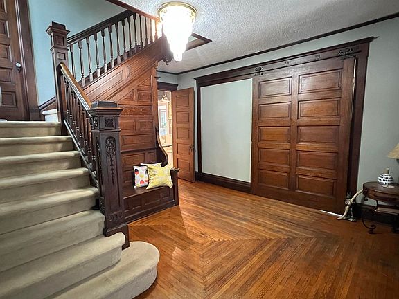 A TIMELESS TREASURE LOCATED ON A LOVELY COBBLESTONE ROAD JUST DOWN THE STREET FROM THE SCENIC WALKING BRIDGE OVERLOOKING THE CEDAR RIVER IN THE BEAUTIFULLY TREE LINED NEIGHBORHOOD! Enjoy listening to the birds on the enclosed front porch with your cup of tea. A grandiose ornate staircase in the foyer is the first sight to greet you along with the towering sliding barn door made of sturdy wood. Charming hardwood floors carry throughout the main floor stretching from the foyer, around to the living room, and across to the formal dining room. Old school charm in the kitchen is showcased in the cabinets and countertop sink, dining area nook includes a built in bench. 2nd staircase hidden off the kitchen. 4 bedrooms & full bath upstairs. Sprawling attic space has finishing potential. Bonus living space, laundry, storage, shower stall, and sink in the basement. Enclosed back porch opens to the concrete patio and fenced backyard. All that's left to do is make this home your dream come true!
