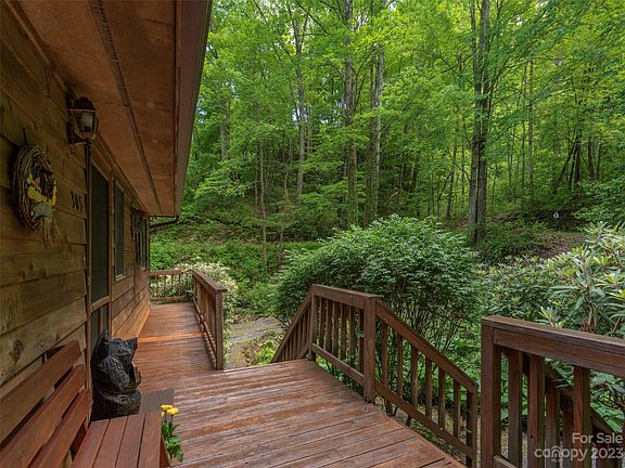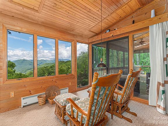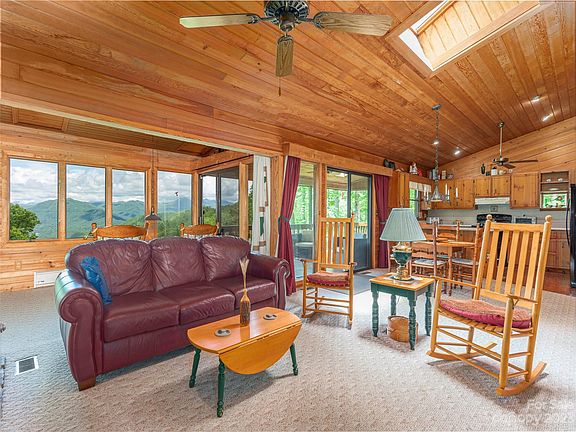 Welcome to this furnished rustic mountain cabin! Rich with artifacts, this charming home is located 3 miles off Hwy 74, offering easy access while providing a peaceful retreat. Nearby you will find Cherokee, Dillsboro, and charming Sylva. Situated at a 3,000 ft elevation, this property provides stunning year-round mountain views of Smoky National Park and Water Rock Knob. Relax in the 2-person hot tub, enjoy the four seasons room with walls of windows or an afternoon by spring-fed fish pond. Inside, you'll find a living room with cedar walls, a stone wall, and a wood stove, as well as a kitchen with custom rustic cabinets and pine floors. Two bedrooms and two bathrooms with skylights on the main level, while the lower level features one bedroom, one bath, a bonus room, and a den. A single garage with a workbench, and an outbuilding with electricity and attic storage. Other highlights include updated metal roof & HVAC system. Totaling 3.63 acres, this property offers space & privacy.