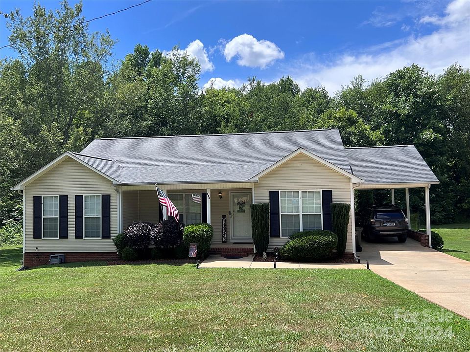 Four-bedroom ranch home on almost an acre lot with a covered front porch. The living room features a vaulted ceiling and hardwood-looking laminate floors. Large kitchen and dining room. The kitchen features lots of cabinet space and an island. Range, refrigerator, dishwasher and microwave are included along with the white storage cabinet. The master bedroom has a huge walk-in closet and private bathroom with dual sinks, soaking tub and separate shower. There are 3 large secondary bedrooms. One of the bedrooms sits at the front of the house and would make a perfect office or playroom. The private deck overlooks a tree lined backyard with space to explore and a playset for the kids. The lot is .88 acre with a storage shed and garden area. One car carport and one other paved space along with a long driveway for parking. Tall crawl space – great for storage. Power is REMC. Washer and dryer included. Compressor replaced in 2022.