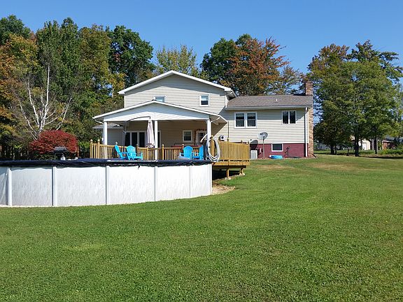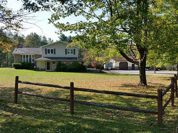 Split level with 2 car attached garage and 36x44 two bay detached garage that has air/heat/water. House is on 2.74 acres and is bordered by woods in the back and a community park in the front. very quiet and secluded.
