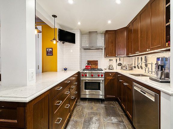 The contemporary open kitchen features a breakfast bar with durable Caesarstone countertops, custom cabinets, expansive counter space, as well as new stainless-steel appliances: Marvel wine refrigerator, Liebherr refrigerator, Bosch full size dishwasher, and Wolf cooking range. This fully renovated chef's kitchen also a separate pantry for all of your storage needs and a built in screen/monitor for viewing options.