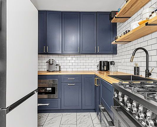 Enjoy cooking in the renovated kitchen with custom cabinets, gleaming subway tile, great countertop space and new stainless-steel appliances including a 24” Bertazzoni Range, full size refrigerator, sleek microwave, and Fisher & Paykel space-saving drawer dishwasher – exceptionally quiet and remarkably efficient.