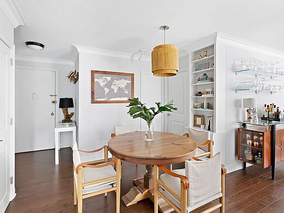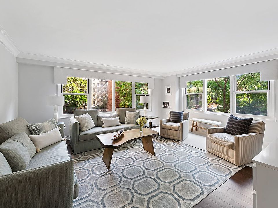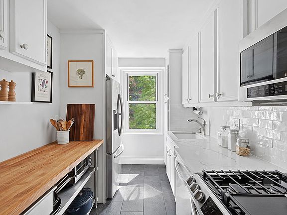 Move right in to this bright and light renovated 2 bedroom, 1 bathroom co-op. Spacious and well laid out, this corner unit is flooded with light all day from sunny east and north exposures. The perfect layout starts with a gracious entry foyer that opens to a separate dining area which easily accommodates seating for six. Beautiful hardwood floors, crown moldings and a neutral palette add sophistication to the space. The oversized corner living room is comfortable and gracious with views over lush green treetops. A renovated windowed kitchen has white cabinets, a hand glazed subway tile backsplash, crisp quartz countertops and Samsung appliances including a 5 burner gas range with griddle and a french door refrigerator with icemaker and water dispenser. In addition this apartment has its very own washer dryer!