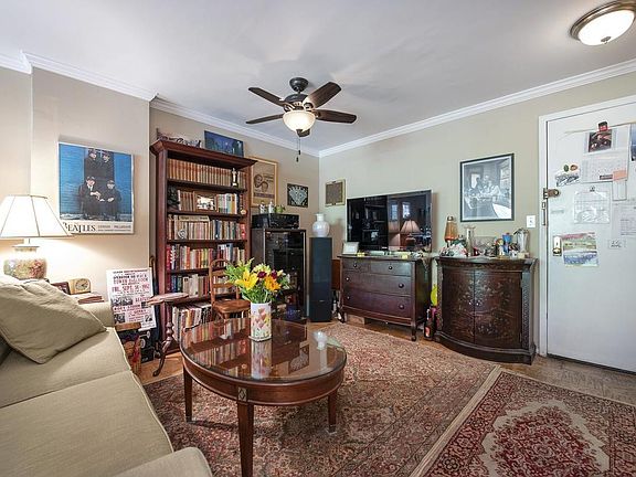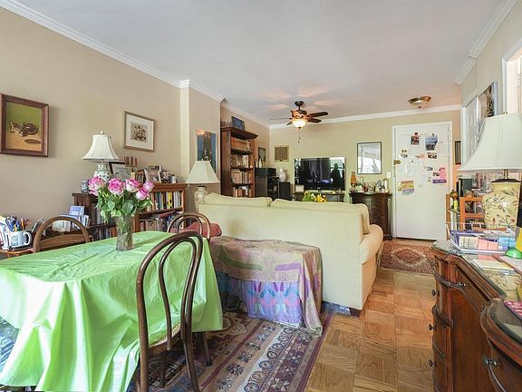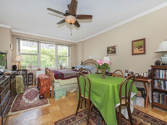 This quiet and sunny large studio offers a contemporary layout with endless potential! The living room is large enough to fit a full dining table as well as bedroom and living room. There is ample space that could be easily transformed into a separate sleeping alcove should you wish.There is a dressing room area with closets on both sides leading to the bathroom. The eastern exposure provides tranquil courtyard calm and lovely tree views in the newly renovated green space with great sunlight. Thermostatically controlled air conditioning and heating is included in the monthly maintenance. Hardwood floors and closet space throughout the apartment. Washer/dryer can also be added.