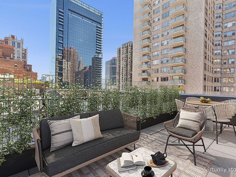 With a generous 1,000 square feet, this two-bedroom, one-bathroom home boasts a beautifully renovated interior that exudes both comfort and style. Enter inside and soak in the abundant natural light that floods through the modern eat-in kitchen complete with stainless steel appliances, sleek cabinetry with plenty of storage, double windows for airy vibe and views of Tudor City. The adjacent bedroom opens up to your private 200 square foot terrace where you can enjoy the magnificent city and skyline views making it an ideal space for unwinding after a long day. The spacious living/dining room is fit for hosting guests or enjoying cozy evenings in. The large primary bedroom which can easily accommodate a King-sized bed boasts large closets and built ins for a clutter free lifestyle.