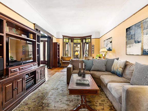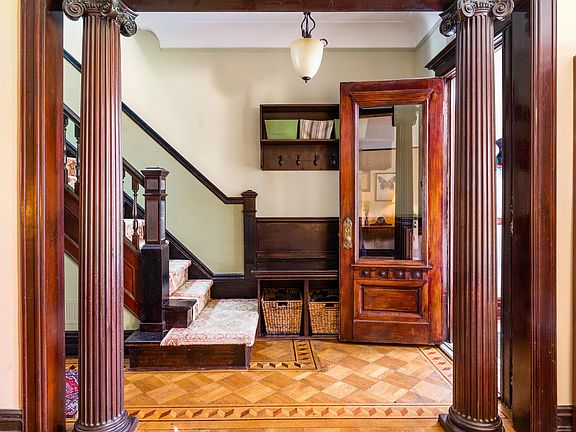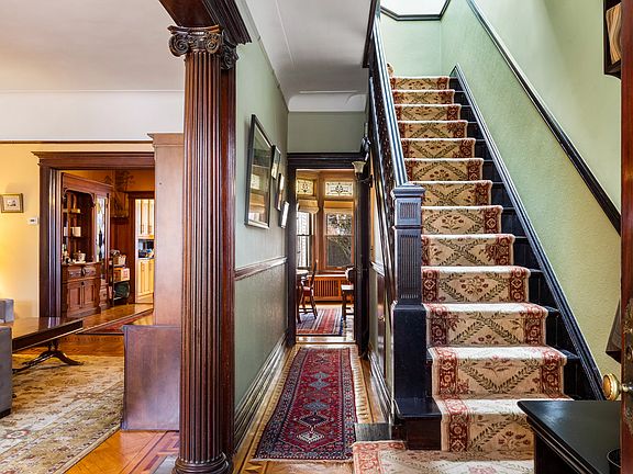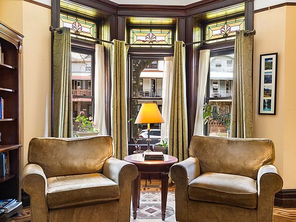 Stunning Four-Bedroom Prime Kensington Townhouse- only four owners in its history including John McDonald (McDonald Avenue) and Scholastic children's author, Ruth Chew. This four-bedroom limestone with two full and two half baths is situated on a quintessential Brooklyn tree-lined side street just blocks to the leafy green expanses of Prospect Park and Greenwood Cemetery. Built in 1915, the two-story townhouse is set on a 20 x 100 foot lot and has been used exclusively as a single-family home, but is a legal two-family. Passing through the mud area entryway, an exquisite foyer showcases brilliantly detailed original wood columns and doors opening to an expansive and bright living room. Featuring oversized updated windows, a reading nook and a spacious parlor leading into an equally spacious dining room, this house is perfect for gatherings and entertaining. Separated by pocket doors, the formal dining room is adorned with striking original period wallpaper and stained glass transom windows, a chandelier, ornate built-ins and room for a large dining table with ample seating. Additionally, the parlor floor boasts a half bathroom and an updated kitchen with custom wood cabinetry, granite countertops and stainless steel appliances including a hooded Wolf 5-burner cooktop and Bosch dishwasher. The back door from the kitchen leads out to a serene and sprawling garden with bluestone patio! A classic bannistered staircase leads you to the upper floor which brandishes four bedrooms with soaring ceilings and crown moldings throughout, oversized windows, two full baths, generous closet space, and updated vented skylights. The English basement, with a separate front entrance, has an updated laundry room, additional half-bath and new hot water heater. The remainder of the basement space is partially finished and provides ample space for storage. It is currently used as a workout and music area, but could easily be converted into guest quarters, an office or media room. With its truly alluring original hardwood floors, moldings and columns, updated electric service and wiring, and dual zone central AC, this bright and well-maintained townhouse with its open and inviting layout is a rare gem. this bright and well-maintained townhouse with its open and inviting layout is a rare gem. It strikes the perfect balance of a peaceful backyard oasis with the neighborhood mainstays of restaurants, grocery stores, coffee shops and the F/G trains just moments from your doorstep. PLEASE NOTE: OPEN HOUSES ARE BY APPOINTMENT ONLY
