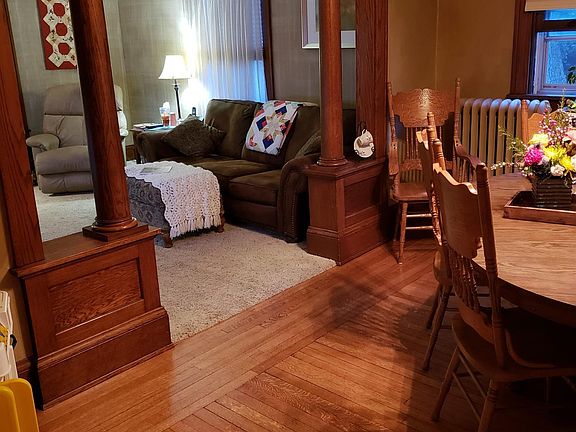 This stately four bedroom comes loaded with character. There is original woodwork throughout, solid oak floors, and a spacious main level. The kitchen is right off the back entrance and will come with all the current appliances. This opens to a dining room & living room area with beautiful built ins and leads over to an enclosed front porch. One main level bedroom with 1/4 bathroom. Heading up the stairs, you will find three VERY generously sized bedrooms and the main bathroom for the home. Downstairs, there is a spare office space (no egress), utility area (complete with laundry shoot/sorting area) and excess cold storage space. The landscaping has been delicately maintained and there is plenty of room in the backyard for families to entertain! The one stall detached garage (Part of a two stall shared with neighbor) has access from the alleyway. Buy for less than rent and enjoy all that Lake Mills has to offer!