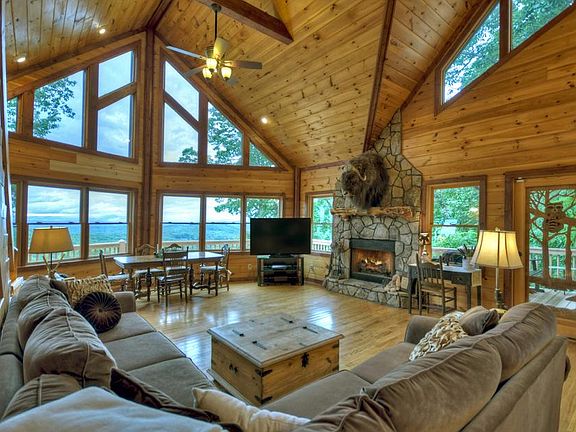 Craftsman Quality shines in this showcase treehouse lodge style home...cabin boasts 3 bedrooms + lovely loft/3 baths, open living /kitchen/dining concept with massive stone fireplace & soaring ceilings, master ensuite boasts private sleeping balcony, vaulted ceilings, sitting area and cozy fireplace, spa like bath with jetted tub & walk in steam shower, spacious kitchen features custom cabinetry & granite counters with oversize island, fully finished terrace level with guest quarters & rec room/den, upscale & unique extras, plentiful windows to take in the view from the prow front, layers of plentiful porches & decks overlook storybook setting with mature landscaping & fabulous fire pit area, oversize party porch with warm fireplace & cozy comfort, covered parking & gated driveway, abundant wildlife...quaint & quiet upscale community tucked away from town with unmatched gorgeous mountain views, yet just minutes from USFS hiking and biking trails historic downtown Blue Ridge, Lake & River, tasteful furnishings and decor are optional and complete the package...it's a must see!