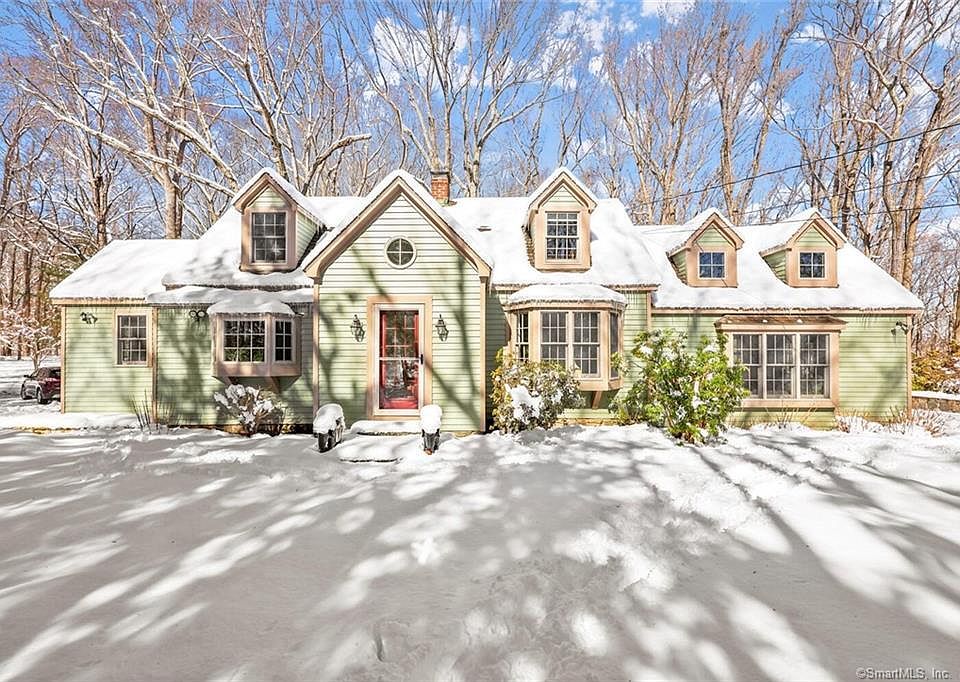 Atop one of towns east-side ridges, on 2+lightly wooded acres, sits this expanded 1940 Cape Cod style home offering serenity & privacy. Its classic core of 3 BDRMS, 2 FBTHS, KIT, LR w/ gas fpl, FOYER & CENTER STAIRCASE has been expanded/updated while keeping quintessential charm of dormers, bay windows, built-ins, hardwood FLRs, nooks & crannies.Today, step down into the 19x18 LR w/soaring ceiling, 3 sky lights, quadruple French DR opening to granite stone terrace, deep bay window w/cushioned seating flanked by built-in cabinetry & radiant heat fl. Updated KIT w/banquet seating, custom cabinets, granite counters, gas stove. Deep double sink & box bay window. Convenient side entry door enters a Mud RM w/radiant heat floor, built-in bench & shelving, washer/dryer & adjacent to KIT. A BDRM (offering Primary option) Full updated BTH & DEN complete 1st fl. On 2nd level is a 22x15 Primary BDRM w/raised ceiling, windows for natural light. Remodeled Bath w/walk-in glass shower, pebble fl. double sinks, skylighted ceiling & heat lamp, also services an additional BDRM. A 1940's 2 car garage under, has been used for hobbies & storage. This area houses furnace, mechanicals & will need to be brought to code for garage use. The driveway (partially an easement over neighbor's yard) crosses a bridge & sweeps up through the beautiful woods hosting White Birch, Pines, Shakespeare Garden designed perennial beds, shade garden, irrigation & deer protection. Shed & Pond views. Great SE location!