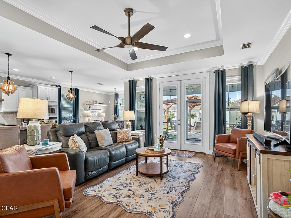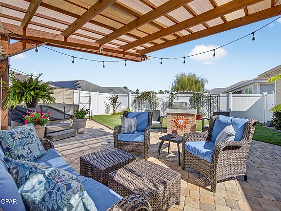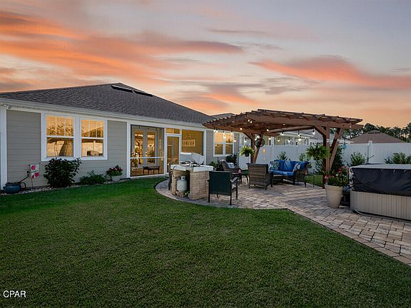 This beautiful Shearwater model by Southern Coastal Homes blends farmhouse-inspired charm with modern comfort in one of Panama City Beach's most desirable neighborhoods - Breakfast Point. The thoughtfully designed 3BR/2BA layout begins with a private foyer that opens to a spacious great room, creating an inviting flow for both everyday living and entertaining. Luxury vinyl plank flooring flows through the main living areas, while tile adds a polished touch in the baths and plush carpeting brings comfort to all bedrooms. The kitchen features a 4-burner gas cooktop, stainless appliances, custom soft-close cabinetry, and an island with a breakfast bar - perfect for casual dining or weekend get-togethers. The primary suite offers a relaxing retreat with a tray ceiling, tile shower, soaking tub, double vanity, and generous walk-in closet. Two additional bedrooms and a full bath provide comfortable accommodations for family or guests. Step outside to a covered patio overlooking a beautifully landscaped backyard with pavers, a pergola, and lush greenery, an ideal setting for morning coffee or evening gatherings. A covered front porch and two-car garage complete the thoughtful design. Breakfast Point offers a peaceful, green setting with wooded conservation land, parks, trails, and playgrounds, yet is just minutes from the beach, Pier Park, Frank Brown Park, shopping, restaurants, and top-rated schools. Golf cart-friendly streets make getting around easy. Your next home awaits - arrange a private tour today!