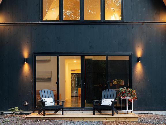 As you drive along the winding country road to this home, passing summer camps and mountain vistas—you know you’ve officially arrived in the Great Northern Catskills. Through a screen of towering evergreens, you start to make out a sleek black angled roof, and then turn down a gravel drive to approach the windowed facade of the Onyx Aframe. This new construction cabin is tucked into a woodland clearing, providing privacy and peaceful forest views from every window. The soaring ceilings inside reach 29 feet at the apex—while a wall of windows facing northwest awashes the open concept living area in soft natural light. The main level features polished concrete floors, an open-flow living space, two bedrooms and a full bathroom. A sleek black kitchen with metal cabinetry, tiled backsplash, and a floating island with built-in storage, anchor the living space. The dining area provides plenty of room for gatherings, and great scenery through the nearby wall of windows. And the living area offers plenty of space for friends and family to lounge for games or movie nights. Down the central hall on this level are two private bedrooms, each with glass sliders to a side yard with wooded views. These rooms share a bathroom, while two large hall closets provide extra storage and a laundry center. Upstairs is the lofty primary suite, with vaulted ceiling, double-closet, and a private bathroom. This level is open to below, overlooking the living area and offering verdant views through the picture windows on both sides of the home. This 260sf level has scandi-inspired blonde maple plywood flooring and railings, and provides plenty of space for a desk, peloton, seating group, or other accessory uses. The Onyx Aframe is built to high modern standards, and ensures operational efficiency with electric heat pump mini splits for heating and cooling year-round. Both bathrooms in the home have floating sinks, glass shower enclosures, and plenty of natural light. And the front sliding door entry features a deck for taking in the serene forest setting, or gazing at the night stars. Surrounded by nature and outdoor recreation, the thoughtfully designed Onyx Aframe is a tranquil escape for those seeking a peaceful getaway in harmony with the great outdoors.