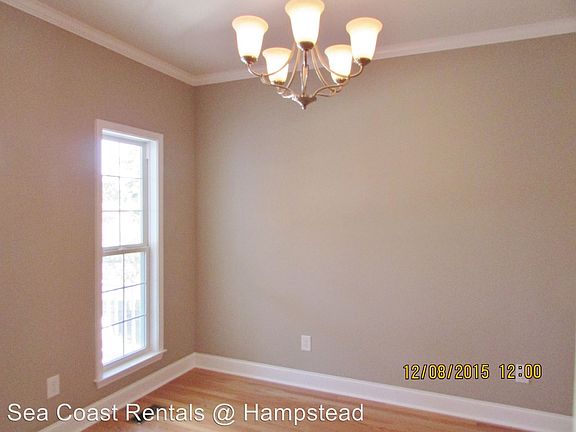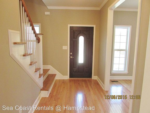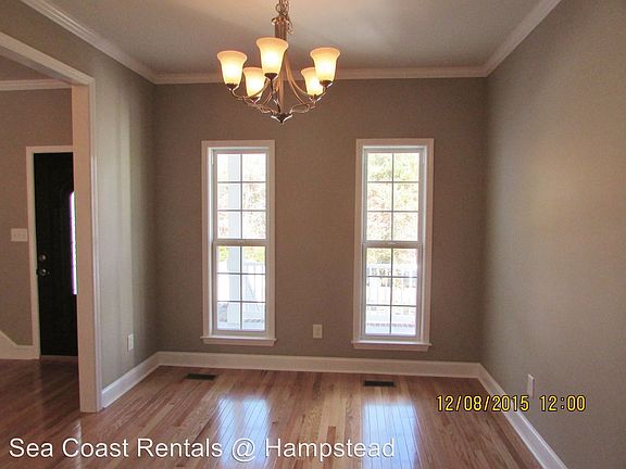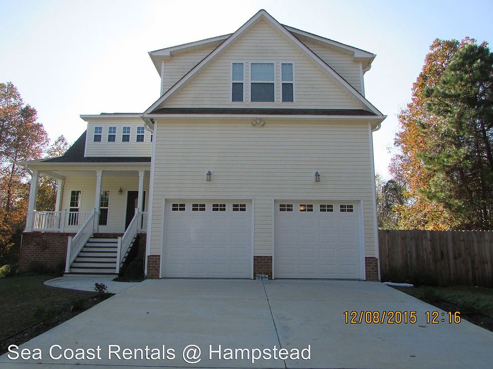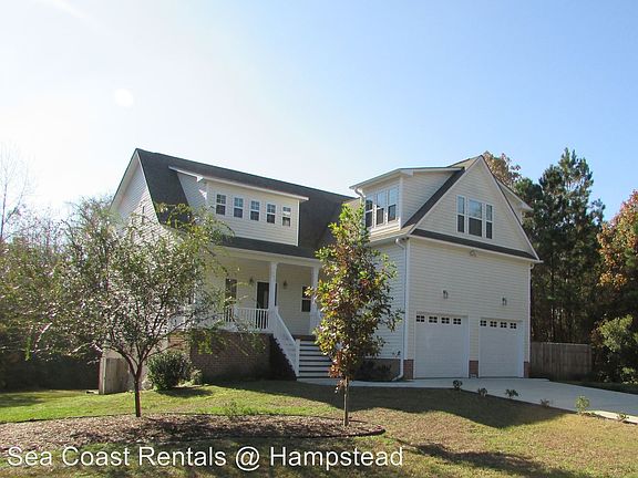 Large home located in Hamspstead - Beautiful home with all the bells and whistles! The gourmet kitchen has granite counters, custom Brookhaven cabinets that feature soft close doors and drawers, a Wolf gas range with induction cook top, and a Wolf 36in oven. The living room features a gas fireplace and is pre-wired for surround sound, cable, phone and internet. The sun room has a tiled floor and leads to a large, 200 sqft deck.The 3rd level FROG is pre-wired for surround sound, HDMI audio and video ready for a projector and screen, and a snack bar area with a microwave, sink and refrigerator hookup. This house has closed circuit TV cameras to monitor the exterior property inside the large storage room. Hardwood floors throughout the home, plus all the baths have tiled tub/shower surrounds and granite counter tops. Separate laundry. Outdoor shower. A master bedroom suite on the main floor with a full bathroom. The 2nd master suite with a bonus room attached on the 3rd floor and a full bathroom with large stall tile shower, Jacuzzi tub with a heated head rest and double sinks with a granite counter top. 2 other bedrooms with a full bathroom in the hall. The ground floor has a mother/father in-law quarters. One bedroom with full bathroom, open living room and dining area with a door to the covered porch area. It has it own kitchen and laundry room as well. This home has a two car garage and backs up to a wooded area. Only minutes from the beautiful Intracoastal Waterway, and within the award winning Pender County school district. Great home for a large or an extended family. Application fee applies Pets neg. no smoking School District: Topsail (RLNE1965923)