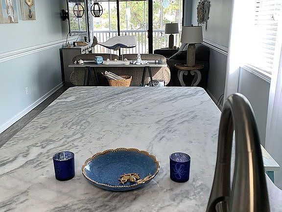 Third floor unit with a great view of the ocean. Two spacious bedrooms and two bathrooms that are tastefully decorated and furnished. Beachy decor and newer stainless appliances. Newer washer and dryer. Extended back porch with views of the pond and pool. Granite countertops and newly painted walls with decorative tile. Great location to the beach and Main Street activities. You won’t be disappointed.