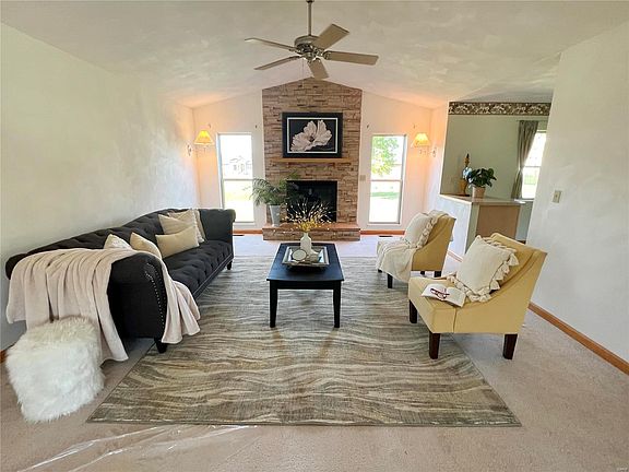 YOUR NEW HOME CAN BE THIS, IF THE PRICE IS RIGHT! Charming and practical, this 2205 sq. ft. three-bedroom, three-bath mostly brick home boasts a spacious eat-in kitchen, a cozy living room featuring a stone fireplace with a heat-venting system to allow 365-day use, along with an auxiliary versatile bedroom perfect for a den or office. Care was used when planning this home with abundant closets in every room, including his and her closets in both the master bedroom and master bath. Large utility room, attic fan, pocket doors, and kitchen island are a few more perks. The 10-foot ceilings in this expansive basement lends to easy expansion. Enjoy the covered patio and a drive-thru dual-access garage. This residence seamlessly combines practicality with elegance, providing a home where both comfort and organization are at the forefront. Located in the highly sought-after Waterloo school district, with its proximity to shopping and restaurants, this home is the epitome of convenience.
