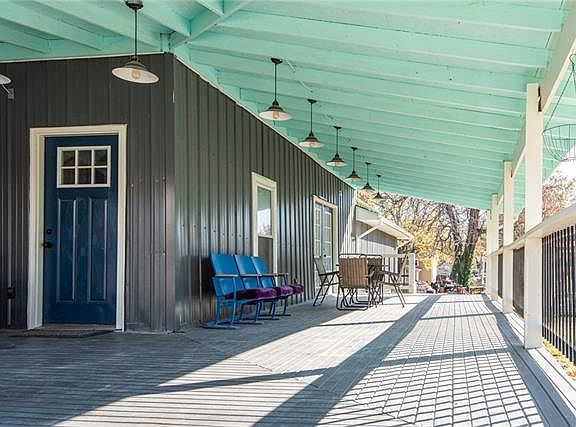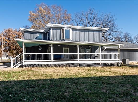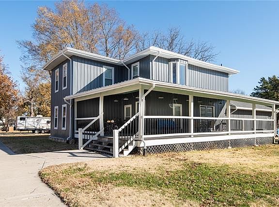 Country home in town. This 1900 home has been stripped to the studs, enlarged and wrapped with a fabulous porch. The home has luxury vinyl flooring throughout which makes it family and pet friendly. Floorplan is fairly open and unexpected in a home this age. Main floor primary bedroom with large en-suite bath. 3 bedrooms upstairs (one is non-conforming without a closet). XL bathroom and second family room also upstairs. Large bedrooms. Oversize 24x30 attached garage has 220 for power equipment and is large enough for full sized vehicles and workspace. There is concrete parking in front and behind the house. Full RV hookups with power/water/sewer are so convenient! The huge wrap around porch is meant for entertaining or just enjoying a cup of coffee and a book. All of this on a corner lot where the seller has built native stone retaining walls along the edges. The home sits on a combination of crawl space and basement celler. Great for storage or storms.