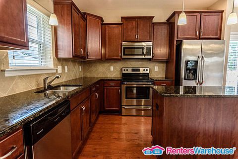 2 weeks free rent! Two-year-old, beautiful 2-story w/Craftsman style details located near I-40! Floor plan features FR w/fireplace, and flows to kitchen accented w/tile backsplash, granite counters and castled cabinets. HW floors, arched passages and trim moldings in breakfast area. All BRs are upstairs and incl walk-in closets. Secondary BRs w/Jack-n-Jill bath, while master suite boasts spa-like bath w/dual vanity, garden tub, sep shower and water closet. Covered front porch and patio in fenced backyard. Pets conditional.