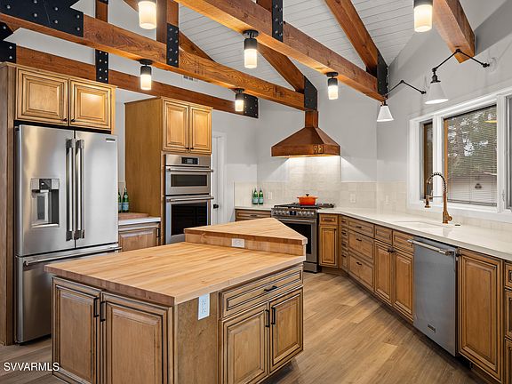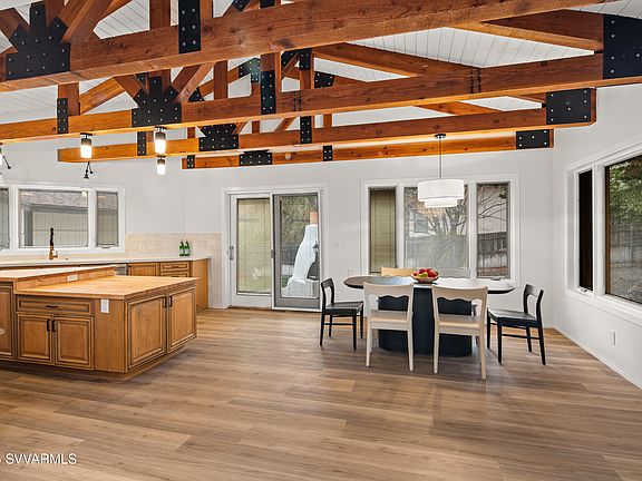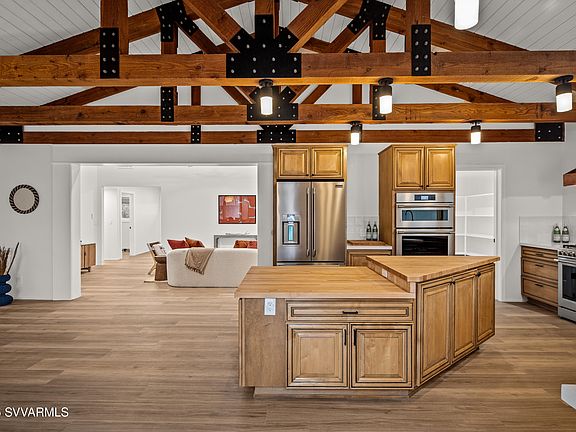 Completely remodeled and ready to go! Fabulous opportunity to own a slice of the Sedona dream in this beautiful 4BR/3BA home with an incredible detached outbuilding/shop on a spacious lot in the heart of West aSedona. New is the word! New roof, new HVAC, new kitchen appliances, new bathrooms, new LVP flooring, new 95/5 finished level smooth drywall, new interior doors & hardware, new door & window trim, new baseboards, new lighting, new window treatments, new closet shelving, new exterior & interior paint, even the garage floors have new epoxy floor coating. The newness sparkles and sets off the architectural truss beamed ceiling, warm wood cabinetry & genuine, restored butcher block island. All you'll have to do is bring your furniture and move right in! The chef's kitchen and spacious dining space are the heart of this home. Enjoy all Frigidaire Professional appliances, with wall oven/microwave combo, and 6-burner gas range (so two ovens total!) with a griddle. You'll find abundant countertops here, a conveniently located large walk-in pantry, in a well-planned design created with cooking and entertaining in mind. This large space opens directly into the living room for the best in open concept living.