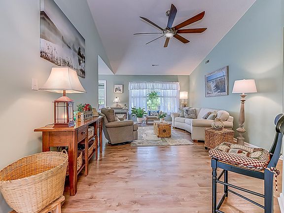 It’s A Beauty in the popular 55+ community of Woodlake Village. Pristine 3 bedroom, 2 bath home with. oversized 1-car garage on a private, wooded lot. Attention to detail and pride of ownership are immediately apparent in this impeccably maintained home with quality throughout. Situated on a lushly landscaped lot, this home has great curb appeal and sets the tone from the moment you drive up. Start with the welcoming low country front porch, light colored vinyl siding with dark green shutters, manicured lawn, palm trees, flower beds and entry storm door. Since the owners purchased the home less than five years ago, they completely and beautifully updated the home to include a new roof and gutters (2023), hot water heater (2019), new luxury vinyl plank (LVP) flooring in living room, dining areas, Carolina Room, 2nd guest bedroom and baths. Completely remodeled kitchen with smooth ceilings, self-closing white cabinets, stunning quartz counters, wainscoting backsplash, stainless steel appliances including gas range, Kohler sink, pull-out trays, attractive light fixture and the addition of a large pantry. Remodeled master bathroom with Italian marble walk in shower, raised vanity, with new mirror and lighting, LVP flooring and raised commode. Guest bath with new vanity, mirror, raised commode and flooring. Entire interior of home painted, smooth ceilings in kitchen and guest bedroom, new ceiling fans In living room, dining area, breakfast nook, Carolina Room, guest bedrooms and new light fixtures. Enclosed screened porch and converted it to an all-season room with windows and heat and air. Widened driveway with extra parking pad and added backyard patio and front storm door. Enter the home into the foyer with attractive LVP flooring and chandelier which opens to the gourmet kitchen and living area with vaulted ceilings and large windows overlooking the backyard. From the moment you step into the house, it says new, updated, open and airy, with its light laminate flooring, neutral walls, updated fans and lighting and large windows. The soothing colors of the custom painted walls will make you feel right at home. The eat-in Chef’s kitchen opens to the bright and cheery dining area with ceiling fan and windows, perfect for entertaining and those more formal dinners. The dining area flows into the Carolina room with windows, ceiling fan and slider leading to the backyard patio. Master bedroom with 2 closets, ceiling fan and updated master bath with walk-in shower and raised vanity. Good-sized guest bedrooms, one currently used as a den. Guest bath with vanity, raised commode and walk-in shower. The Carolina Room is sure to be one of your favorite places to relax, read a good book or just take in the pretty backyard view. A sliding glass door from the Carolina Room leads to an oversized patio overlooking the beautiful, wooded backyard with lovely flower beds, trees and fence. Entertaining comes naturally here – it is truly your own private oasis. What a great spot for grilling, entertaining and building memories with family and friends. The front porch will be the perfect spot to enjoy those evening Carolina breezes. Large laundry room with utility sink, cabinets and vinyl floor. Attached oversized 1 car garage with floored storage area in attic and shelving. Easy to maintain with vinyl siding, gutters, irrigation system and termite bond. Conveniently located just minutes from the beach, golf courses, hospital, marina, restaurants and shopping. Low HOA fees with great amenities including clubhouse, pool, pickleball court, library, shuffleboard and all types of activities. This immaculate home is one you do not want to miss! Measurements and square footage are approximate and not guaranteed. The buyer is responsible for verification.