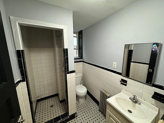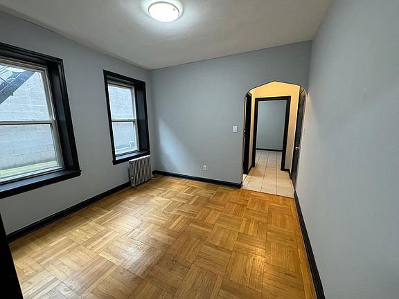 This property offers a functional layout with a straightforward kitchen, featuring wooden cabinets, tiled flooring, and room for a full-sized refrigerator and stove. The living spaces are designed with parquet hardwood floors and large windows, allowing for natural light, while the black trim adds a touch of contrast to the neutral walls. The bathroom is fitted with a retro-style black-and-white tile pattern, providing a distinct aesthetic, and includes a walk-in shower. Ample closet space and a no-frills design throughout make this property an efficient and practical choice for daily living. **NO BROKER FEE** Lease terms: Owner pays water and heat. Tenant responsible for gas/electric Requirements: -Credit - 600 -Income - Monthly income must exceed 3x rent -Clean background